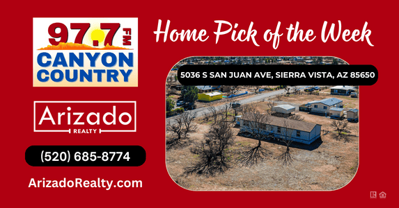 5036 S San Juan Avenue, Sierra Vista, AZ 85650 Price: $225,000Bedrooms: 4Total Baths: 2Square Feet: 2,016Acres: 1Year Built: 2013 Canyon Country 97.7 FM Home Pick of the Week!4 bedroom, 2 bathroom home with new carpet, paint and on a...